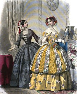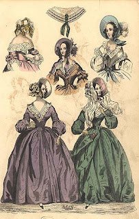 Roupas que limitavam o movimento do corpo, como erguer os braços, cheias de fichus e saias armadas com crinolina enfatizavam a impotência da mulher. Chapéus com grandes abas as impediam de virar completamente o pescoço e limitavam sua visão. Cabelo repartido ao meio com pontas em cacho.