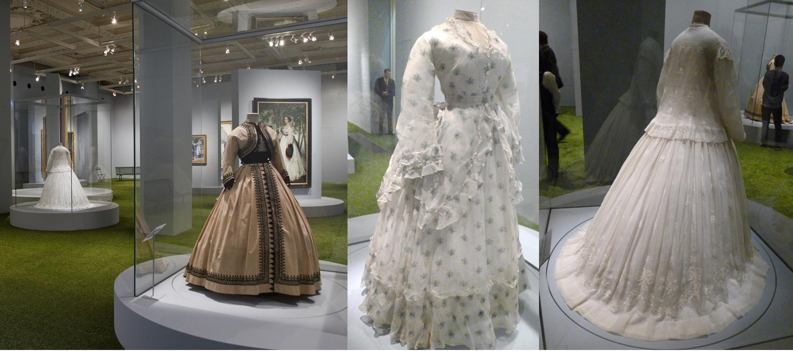 A recreação ao ar livre estava intimamente ligada ao mundo da moda. Parques, jardins dos subúrbios, florestas, eram espaços propícios para usar os vestidos de verão. Esta sessão da exposição tem piso de grama sintética e bancos de jardim. Só faltou a toalha para o piquenique.