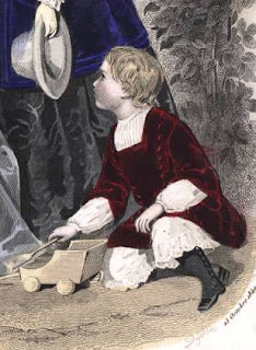 Imagens abaixo: Menino em vestido azul seguindo a moda da época, pantalettes, meia e sapato; À esquera é uma menina, à direita: menino (com pantalettes à mostra); Menino com cabelos longos, franja, vestido e chapéu; 4. menino de conjunto e chapéu.