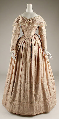 A cintura era um pouco mais acima da cintura original. Os vestidos se abriam levemente na barra como os vestidos das eras Tudor e Elisabetana. Mangas bufantes tinham recortes e enchimentos que lembravam mangas renascentistas. Saias volumosas, decoradas e armadas com diversas anáguas. Na terceira imagem abaixo, notamos inclusive o uso de um rufo.