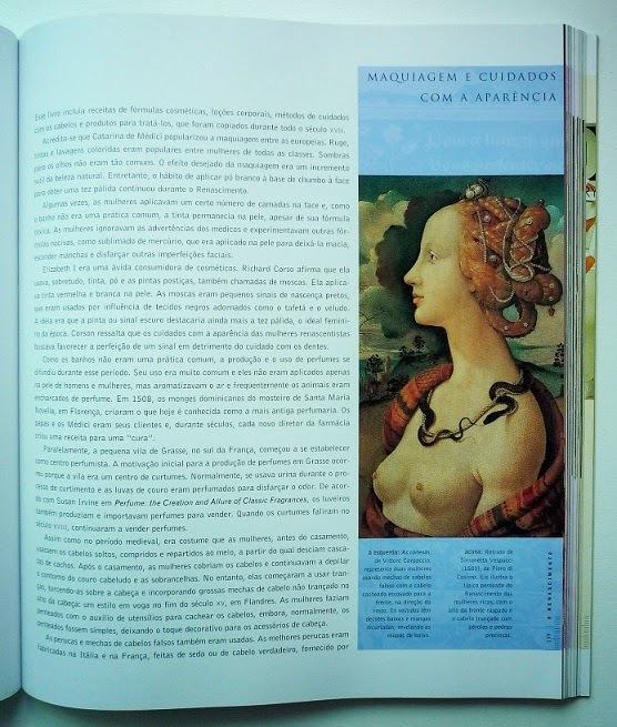 - Beleza e cuidados com a aparência: é um dos diferenciais deste livro. São poucos os livros de história da moda publicados em português que separam um espaço pra falar dos cuidados com a aparência e do tipo de "cosmético" ou maquiagem usadas. Neste espaço também se inclui os penteados.